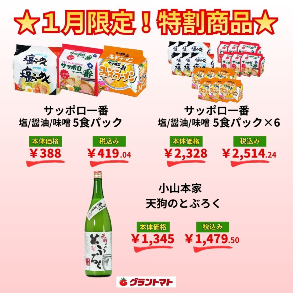 好評の1月限定特割商品のご案内です! 本日は、冬にふさわしい暖まる商品・・・ お酒とインスタント食品です! 今月いっぱい、1月限定での特別価格ですので ぜひ、お近くのグラントマトにてお買い求め下さいませ!