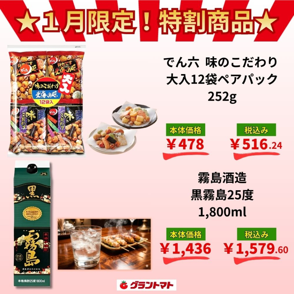好評の1月限定特割商品のご案内です! 本日は、冬のこたつでのんびり晩酌・・ 定番の芋焼酎とおつまみを値下げしました! 今月いっぱい、1月限定での特別価格ですので ぜひ、お近くのグラントマトにてお買い求め下さいませ!