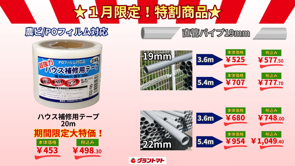 ラジオやテレビでも報道されていますが、 今週は21日頃から大寒波の襲来が予想されています。 大雪に見舞われると、ハウス等は弱った部分から破損や倒壊の恐れがありますので 今のうちにチェックしておきましょう。 本日は、この寒波に備えてハウスの補修や補強に活躍するアイテムのご案内です! 今月いっぱい、1月限定での特別価格で 補修テープは超大特価での販売です! お近くのグラントマトにて、 雪が降ってくる前にぜひお買い求め下さいませ!