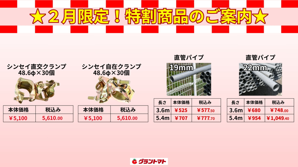 先月の限定特割セールがおかげさまで大好評となったため、 今月も引き続き月間セールを続行する事になりました! 2月限定セールの最初の商品はコチラ! 春からのハウス栽培に向け、部材をご案内します! この機会にぜひ、お近くのグラントマトにてお買い求め下さいませ!