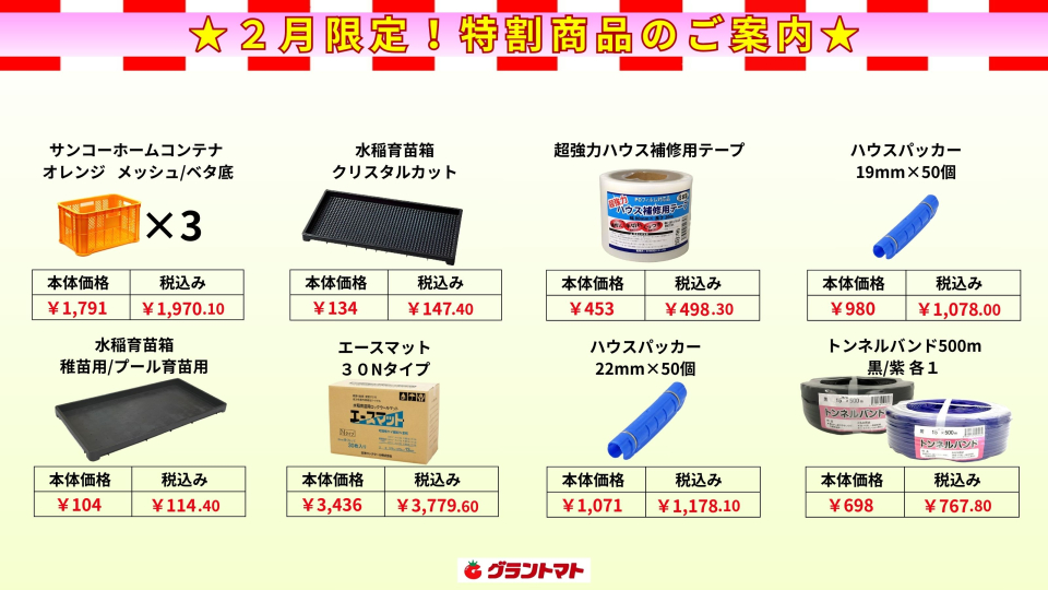 本日は先月に続きハウス資材をご案内いたします。 立春が過ぎると気温の上下はあるものの、これからは少しずつ気温が上がっていきます。 三寒四温のこの時期に、春の作業に必要なものが揃っているか、いま一度チェックしてみて下さい。 欲しいものをお手頃価格で! お得に購入できるのは今月限りです! この機会にぜひ、お近くのグラントマトにてお買い求め下さいませ!