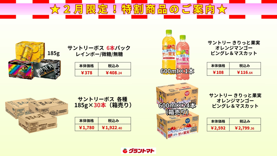 本日はサントリーの定番飲料のご案内です。 今週は気温が上がり、喉を潤したくなる場面が多くなりそうです。 常備用に箱売りもご用意いたしましたので、この機会にぜひお近くのグラントマトにてお買い求め下さいませ!