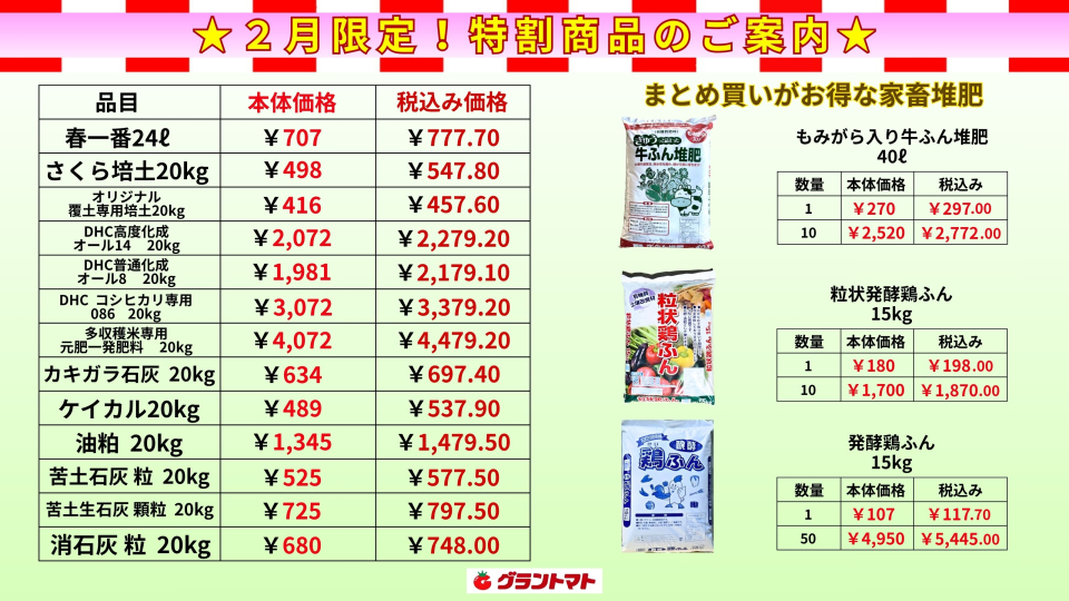 先月ご案内した肥料の特割セールが大好評だったため、今月は家畜堆肥も加えて引き続き限定特価での販売を決行する事になりました。 グラントマトの肥料で地力を増進させ、今年も安定した収穫量を目指しましょう! この機会にぜひ、お近くのグラントマトでお求め下さい!